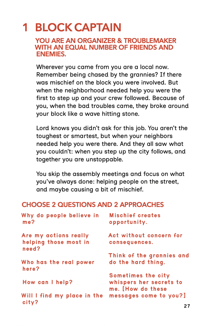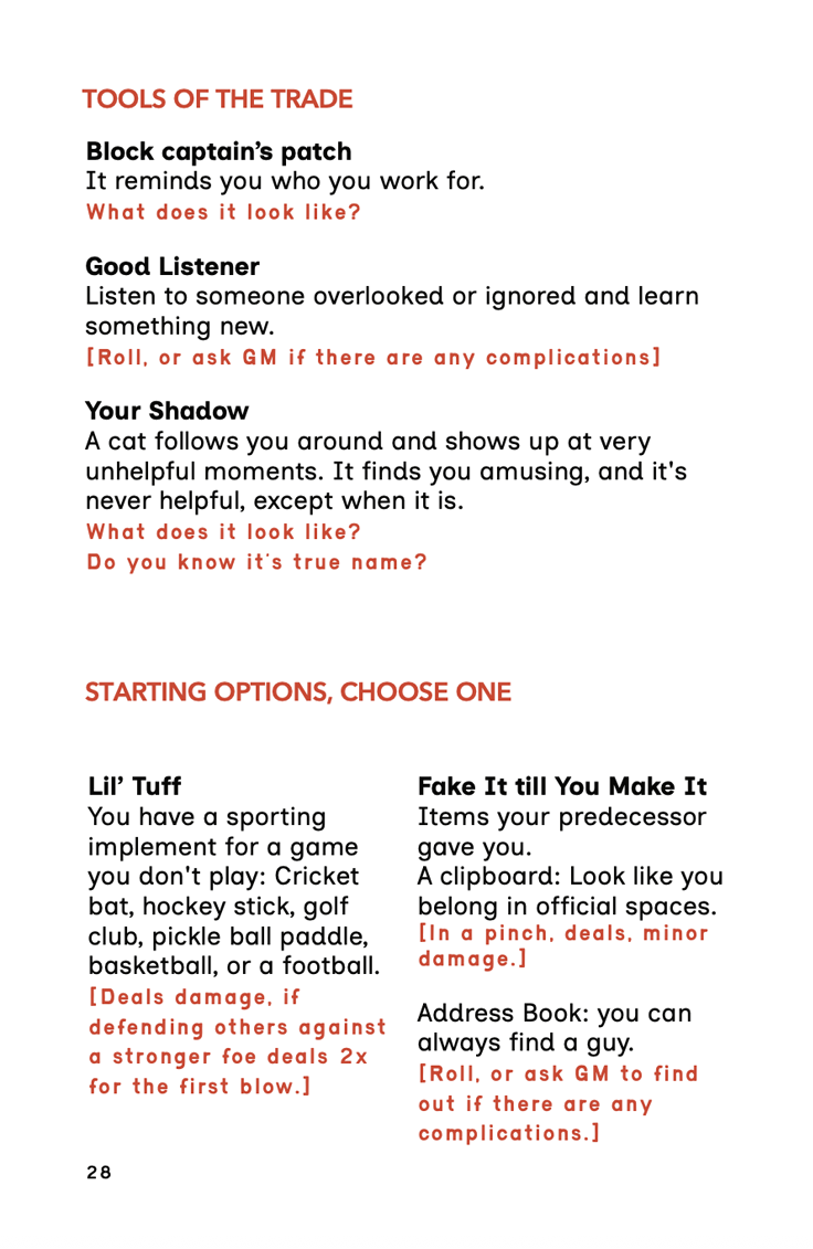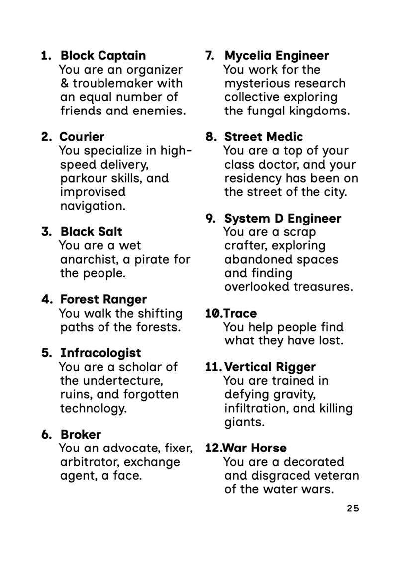 Includes 80+ half letter pages of tables for developing your characters look and vibe, flavor text and inspiring micro-fiction, six backgrounds, twelve types of expertise with advancement options. Featuring incredible original artwork by, Evlyn Moreau, Ingatcio Minaverry, and Caleb Perez.